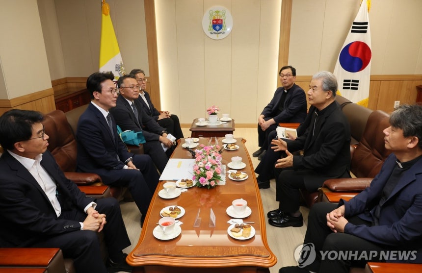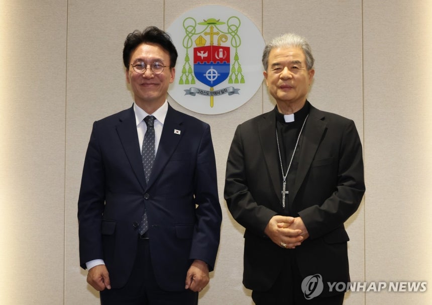 김민석 국무총리가 10일 경기 수원시 천주교수원교구청에서 한국천주교주교회의 의장인 이용훈 주교와 기념 촬영하고 있다.