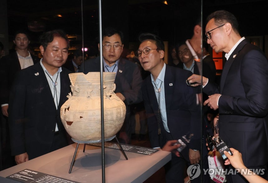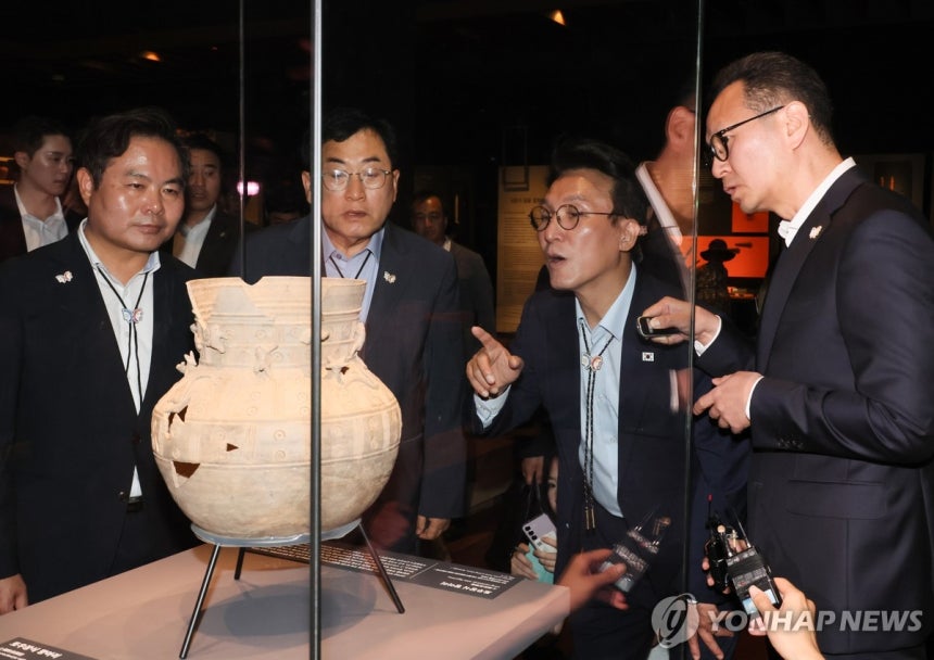 김민석 국무총리가 11일 경북 경주시 국립경주박물관 신라역사관을 방문해 유물을 살펴보고 있다. https://n.news.naver.com/mnews/article/001/0015501749?sid=100