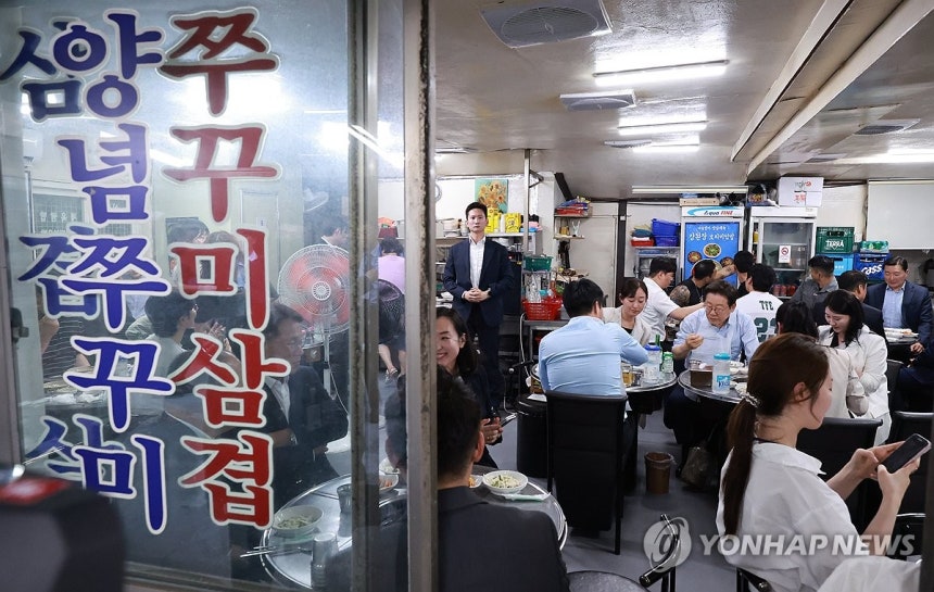 이재명 대통령이 11일 저녁 서울 광화문 인근 한식당에서 시민들과 식사하고 있다.