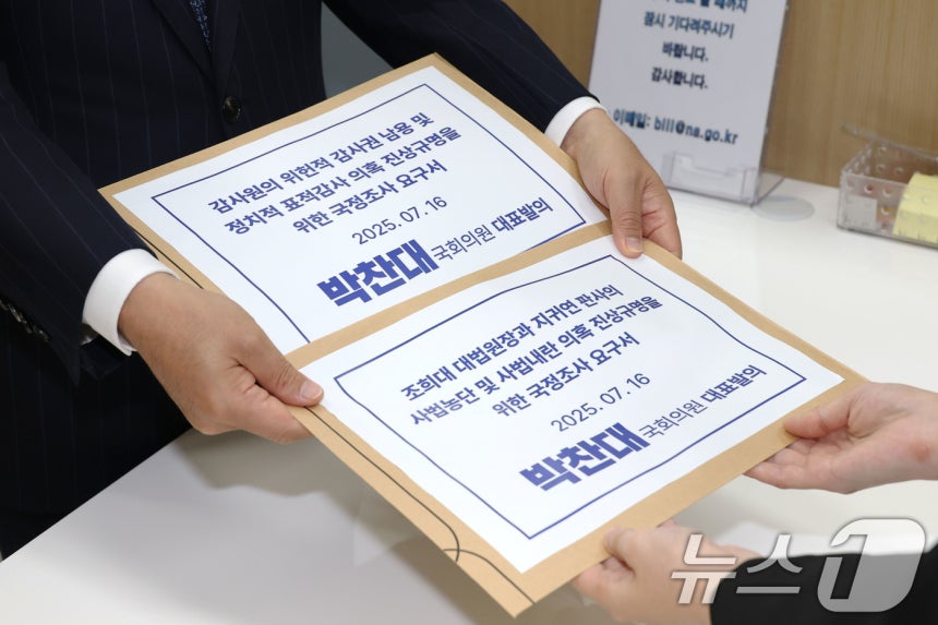 박성준 더불어민주당 의원이 16일 오전 서울 여의도 국회에서 박찬대 의원이 대표 발의한 '감사원의 위헌적 감사권 남용 및 정치적 표적감사 의혹을 위한 국정조사요구서와 사법농단 및 사법내란 의혹 진상규명을 위한 국정조사요구서'를 의안과에 제출하고 있다..