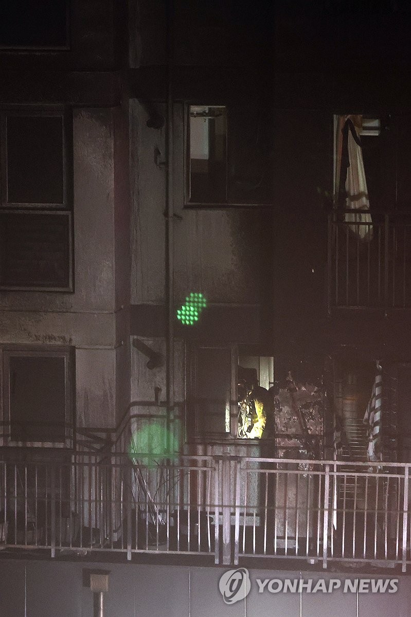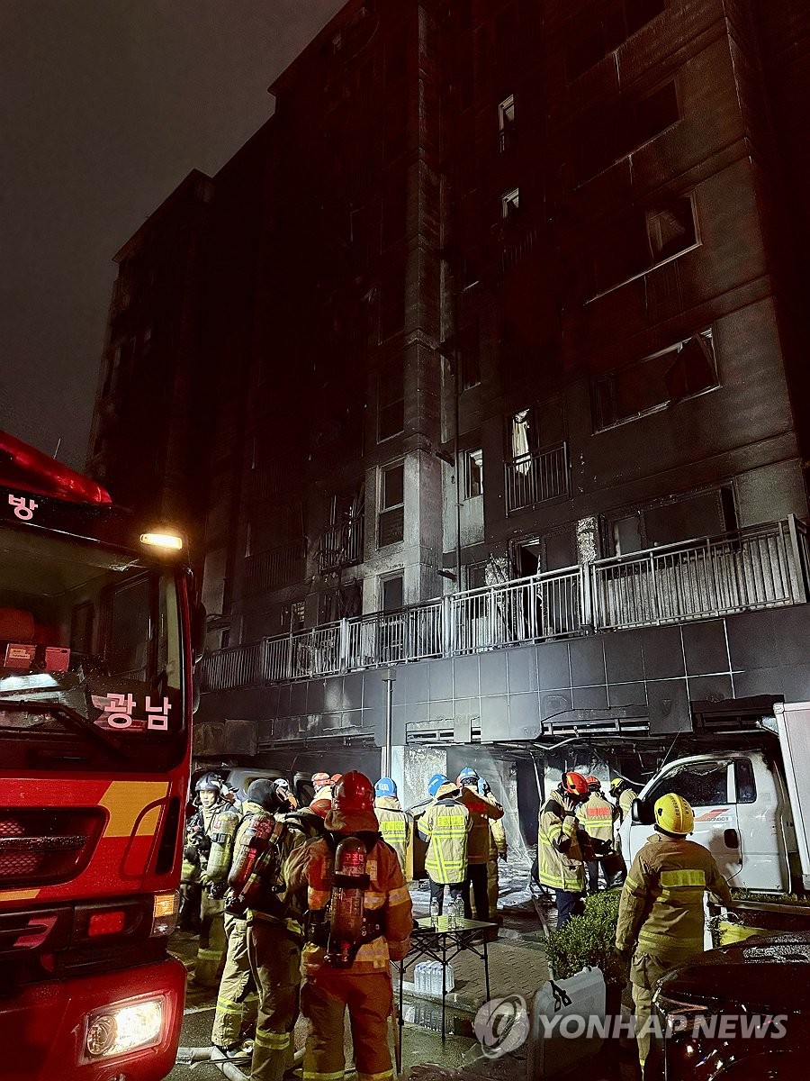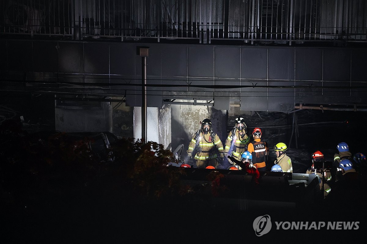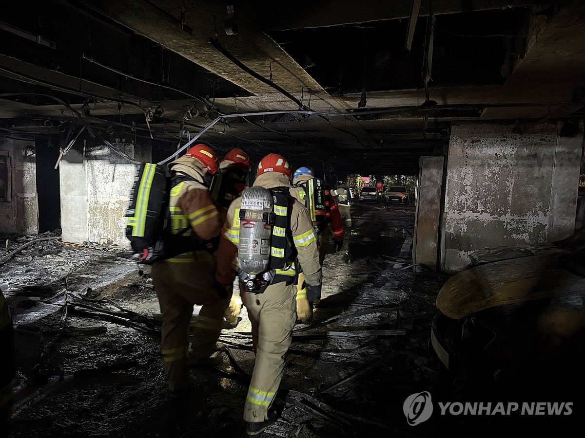 (광명=연합뉴스) 홍기원 기자 = 17일 주차장에 불이 난 경기도 광명시 소하동 한 아파트에서 소방대원들이 인명 수색을 하고 있다. 2025.7.17