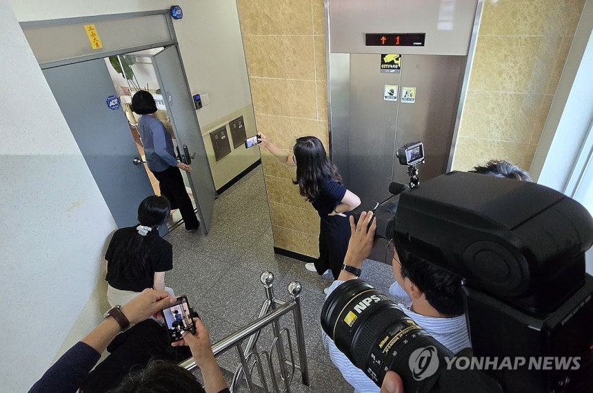 18일 강원 강릉시 국민의힘 권성동 강릉 사무실 앞에 취재진이 모여 있다. 김건희 특검은 권 의원의 국회 의원실과 강릉 사무실을 동시 압수수색 중이라고 이날 밝혔다.