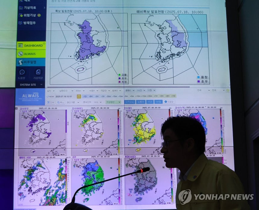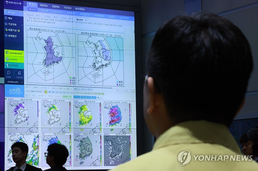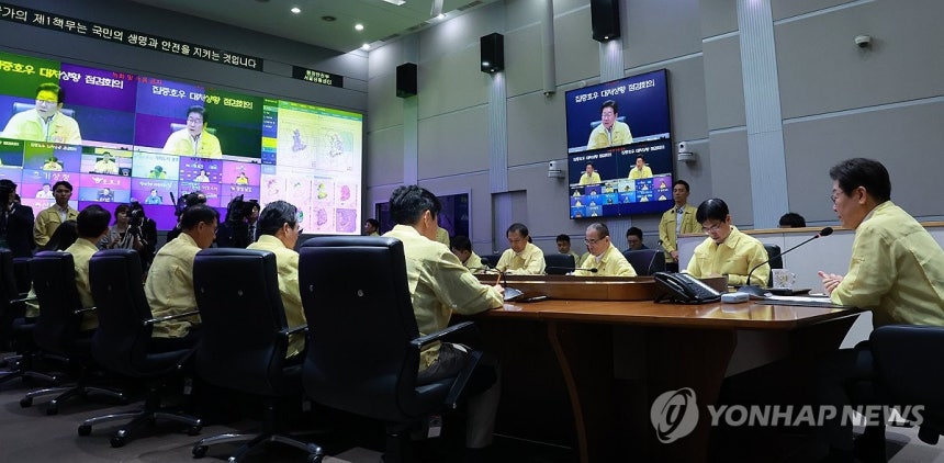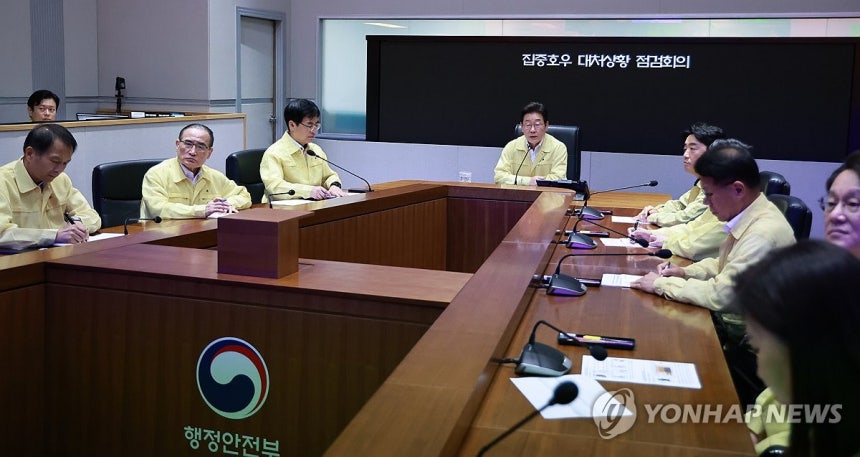 이재명 대통령이 18일 정부서울청사 중앙재난안전상황실 서울상황센터에서 집중호우 대처상황 점검회의를 주재하고 있다.