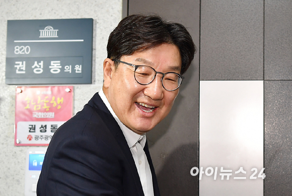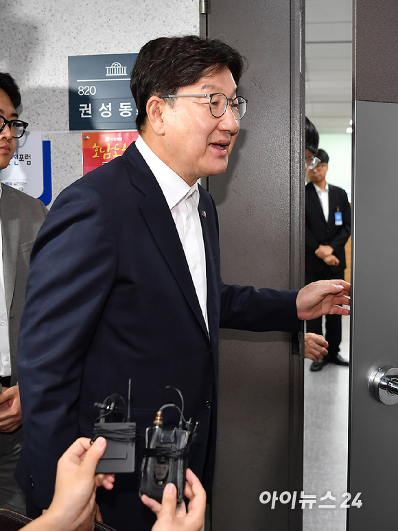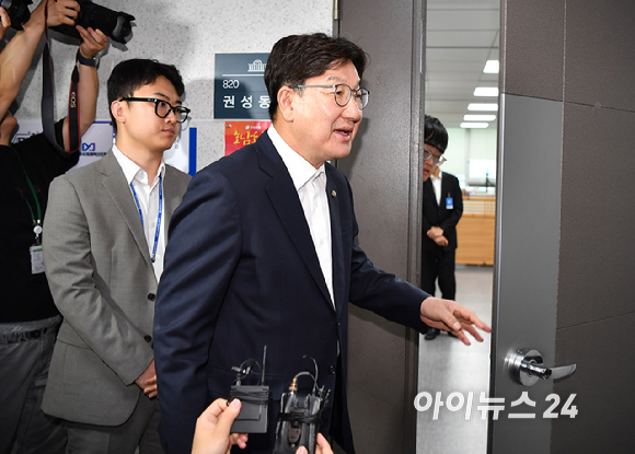 권성동 국민의힘 의원이 18일 자신의 의원실 앞에서 특검의 압수수색 관련 입장을 밝히고 있다.
