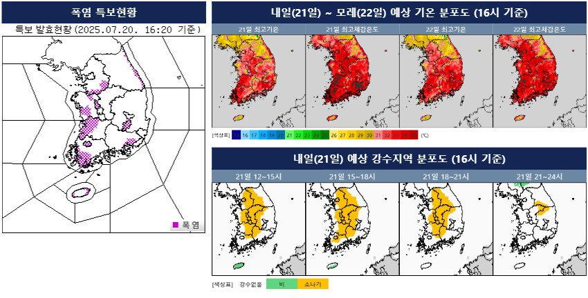 ○ (내일 소나기) 내일(21일) 오후(12~18시)부터 밤(18~24시) 사이 서울.경기내륙과 강원내륙, 충청권내륙, 전라권내륙, 경북내륙, 경남내륙에 소나기가 내리는 곳이 있겠습니다.