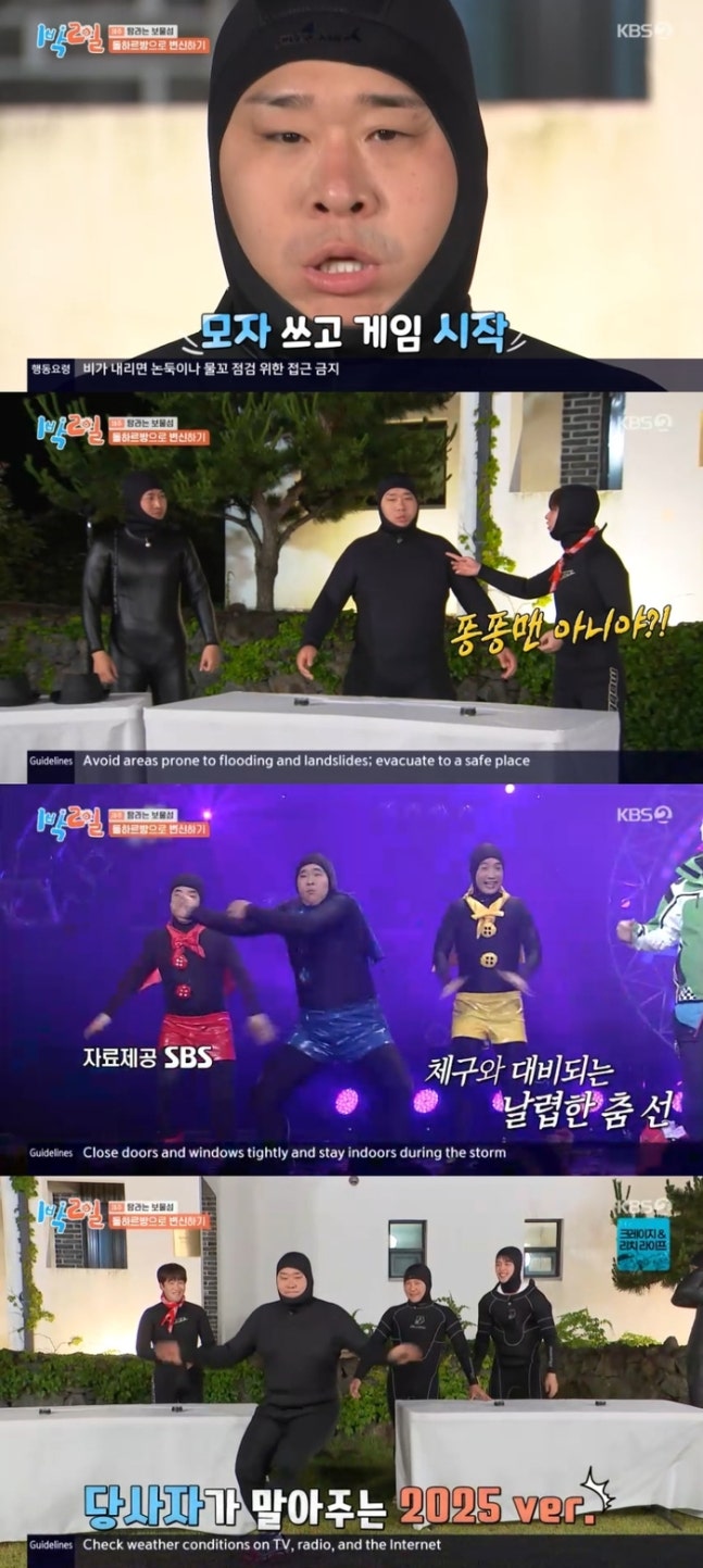 이날 방송에서 멤버들은 해녀복을 입은 채 서로의 얼굴을 위장 크림으로 색칠해야 했다. 해녀복을 입은 문세윤을 본 딘딘은 “퐁퐁맨 아니야?”라고 반가워했다.