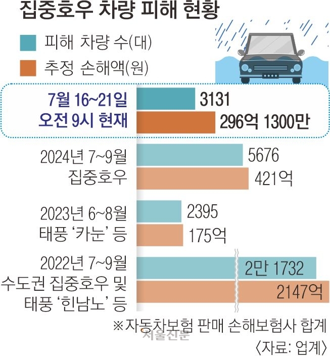 21일 손해보험 업계에 따르면 삼성·메리츠·DB·KB·현대·한화·흥국·롯데·AXA·하나·캐롯·MG손해보험 등 자동차보험을 판매하는 12개 손해보험사에 접수된 집중호우에 따른 차량 피해 건수는 지난 16일부터 이날 오전 9시까지 닷새간 3131건으로 집계됐다. 추정 손해액은 총 296억 1300만원 규모다.