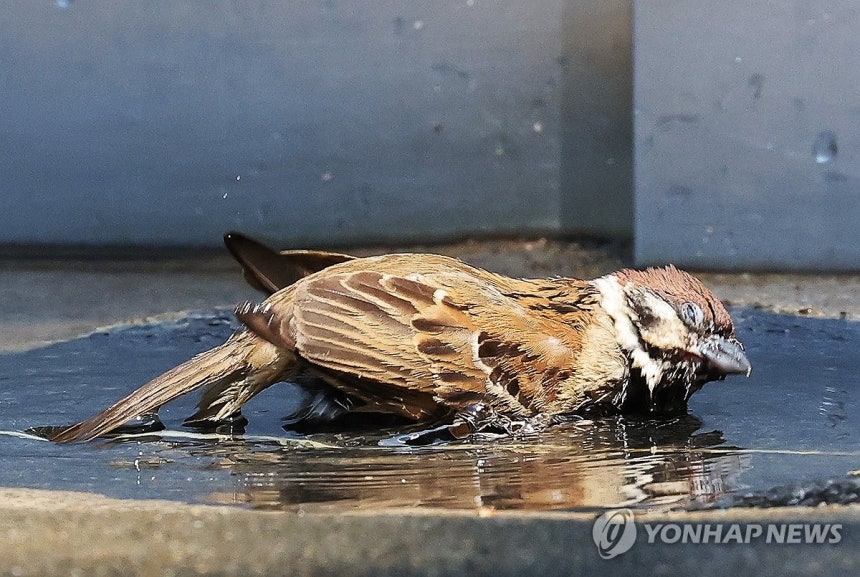 (수원=연합뉴스) 홍기원 기자 = 폭염이 이어지고 있는 28일 경기도 수원시 권선구 올림픽공원에서 참새가 수돗가에 고여있는 물속에서 더위를 식히고 있다. 2025.7.28