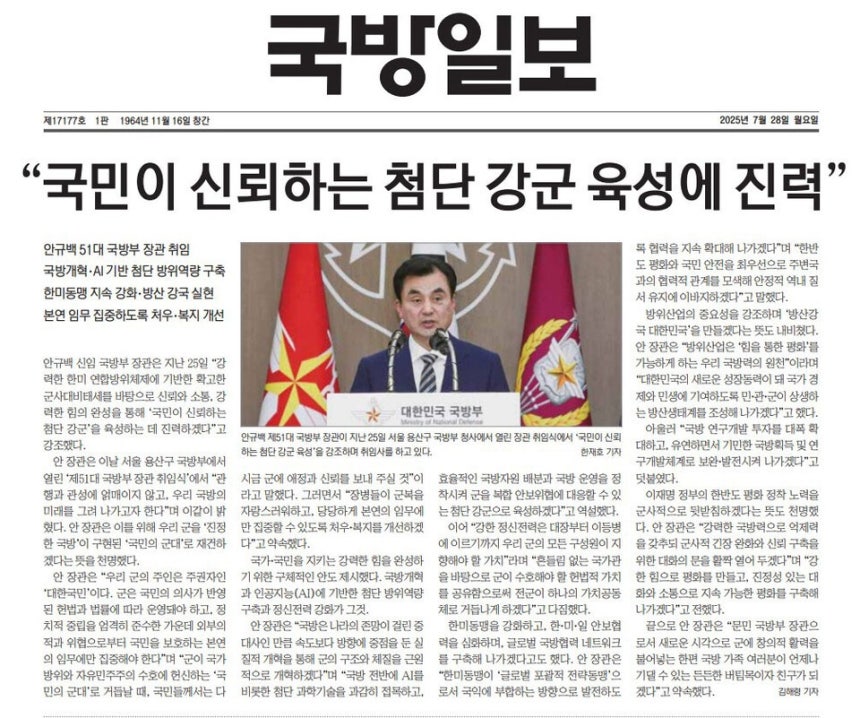 국방부 기관지인 <국방일보>가 안규백 국방부 장관 취임사 가운데 12·3 비상계엄 관련 내용을 누락하는 등 의도적으로 편집했다는 의혹이 일고 있다.