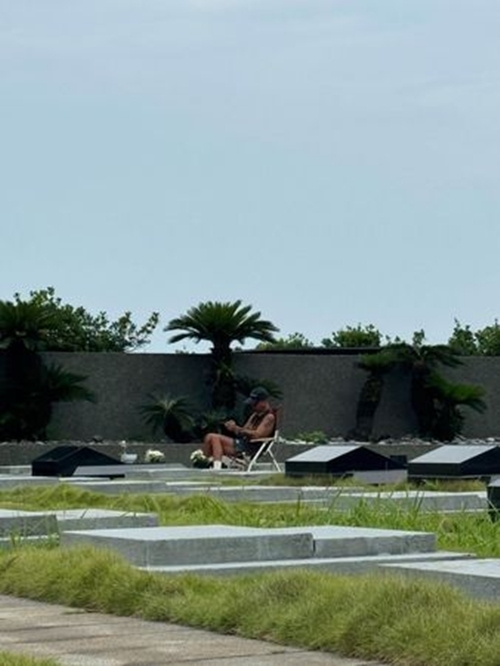 검은 묘비 앞에는 분홍색 꽃과 생수, 그리고 따뜻한 국수 한 그릇이 가지런히 놓여 있었고, 구준엽은 접이식 의자에 앉아 조용히 책을 읽거나 태블릿 속 서희원의 사진을 바라보며 추억을 되새겼다.