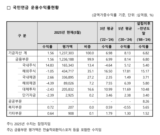 이날 국민연금 기금운용본부는 기금 수익률이 5월 말 기준 1.56%(잠정)라고 공시했다. 4월 말 기준 0.92%대에서 1%대를 회복한 모양새다.