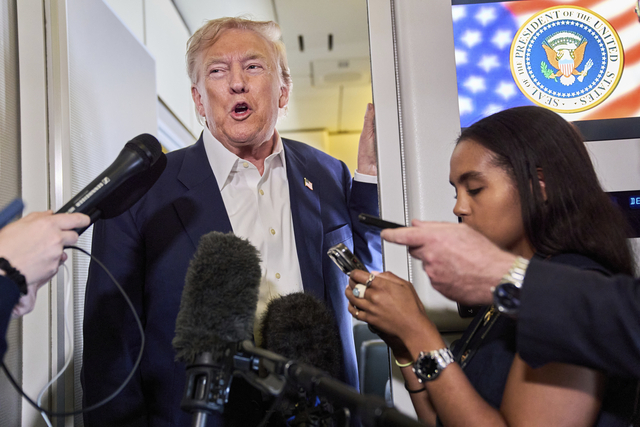 | 도널드 트럼프(왼쪽) 미국 대통령이 29일 영국을 떠나기 전 전용기에서 취재진 질문에 답하고 있다. AP 연합뉴스 |