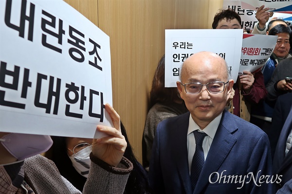| ▲ 안창호 국가인권위원장이 지난 1월 13일 오후 '계엄 선포로 야기된 국가적 위기 극복 대책 권고의 건' 의결에 반대하는 직원들과 시민단체 관계자들에 막혀 전원위원회 회의실로 들어가지 못하고 있다. |
