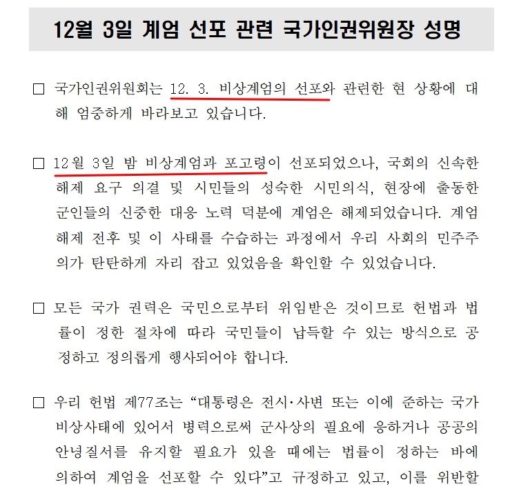 실제 작년 12월 11일 나온 인권위원장 명의 성명에는 "12.3 비상계엄의 선포", "12월 3일 밤 비상계엄과 포고령이 선포되었다"는 등 문구는 등장하지만, 헌법을 위반했다는 뜻의 '위헌'이라는 단어는 찾아볼 수 없다.