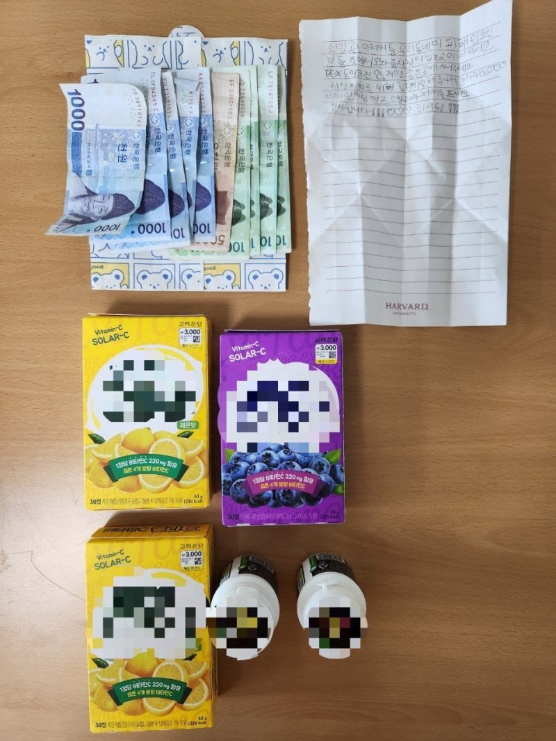 상자 안에는 5만원 상당의 현금과 비타민, 껌 등 1만 3000원어치의 간식과 함께 꼬깃꼬깃 접힌 편지 한 장이 있었다.