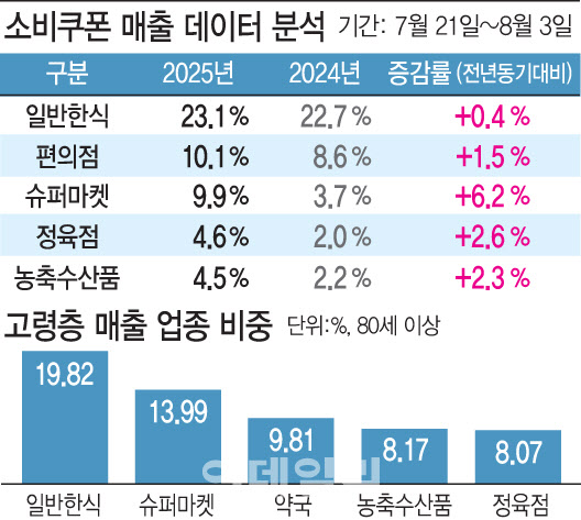 고령층에선 생필품 중심 소비 흐름이 강화됐다. 이는 평소 외식 또는 구매 접근성이 떨어졌던 고령층이 소비쿠폰을 활용해 장보기, 약국 방문 등 목적형 소비를 집중적으로 한 결과로 해석된다. 특히 ‘약국’의 소비 비중이 두드러져, 80대 이상에서 약국 소비 비중은 9.8%에 달했다. 또 60~80대 이상 연령대에서의 소비는 주로 슈퍼마켓, 농·축·수산품, 정육점, 약국 등 실생활 기반 업종에 몰렸다. 예컨대 동네슈퍼 등 슈퍼마켓의 소비 비중은 70대 12.1%, 80대 이상 14.0%였고, 정육점은 70대 7.7%, 80대 이상 8.1%로 나타났다.