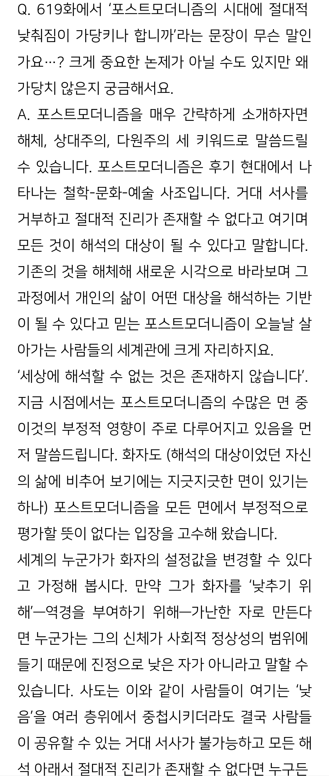 ...포스트 모더니즘이요? 해체, 상대주의, 다원주의요?