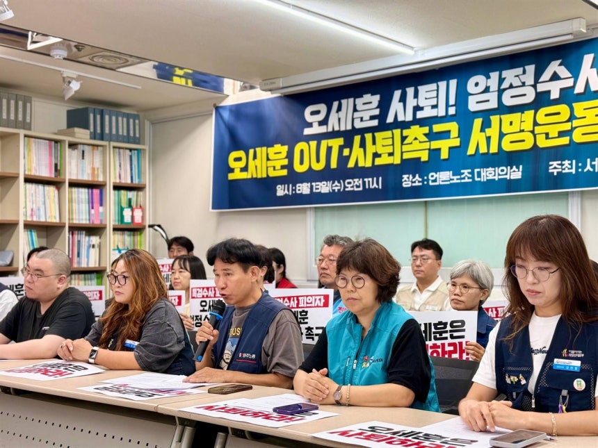 서울지역 315개 노동·시민사회단체는 8월 13일(수) 오전 11시, 언론노조 대회의실에서 '오세훈 OUT·사퇴촉구 서명운동 선포 기자회견'을 열고 서명운동에 돌입한다고 밝혔다.