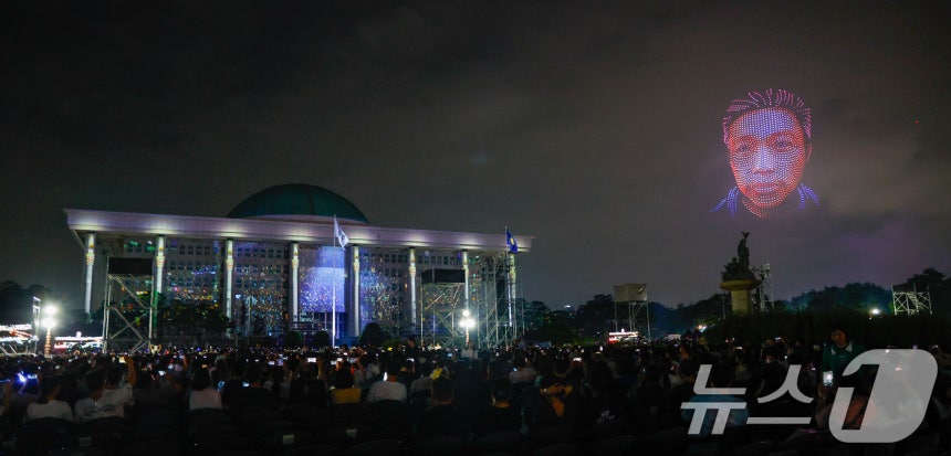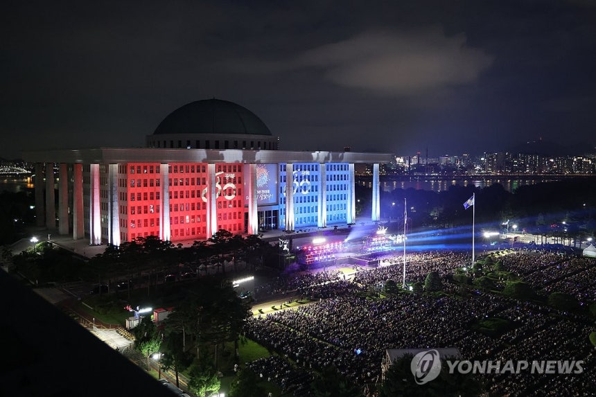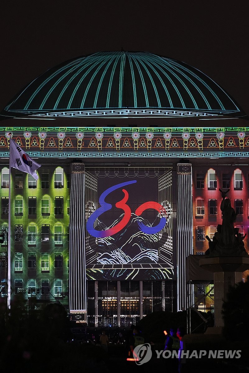 14일 서울 여의도 국회의사당에서 열린 '제80주년 광복절 전야제'에서 미디어파사드 콘텐츠가 본관 외벽에 상영되고 있다.