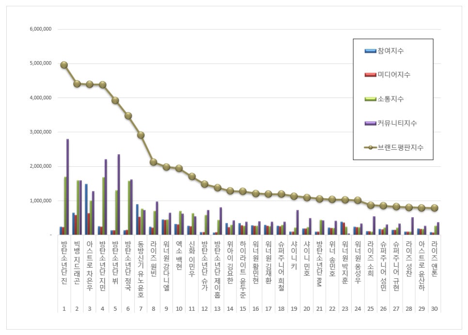 지드래곤(빅뱅)은 4,414,777점(참여 647,060, 미디어 578,213, 소통 1,593,474, 커뮤니티 1,596,031)으로 2위에 올랐고, 차은우(아스트로)는 4,390,489점(참여 1,484,380, 미디어 628,700, 소통 1,000,578, 커뮤니티 1,276,832)으로 3위를 기록했다. 각각 3.25%, 4.69%씩 순위가 올랐다.