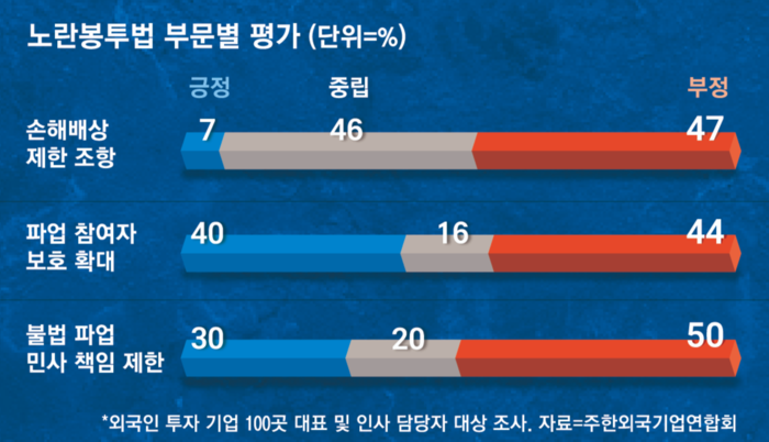 이번 조사에서 외국계 기업들은 특히 쟁의 행위에 대한 손해배상 책임을 조정한 노조법 3조에 대해 부정적으로 평가했다. 파업시 근로자의 고의·중과실이 없을 경우 사용자 측의 손해배상 청구를 원칙적으로 막는 조항이다.