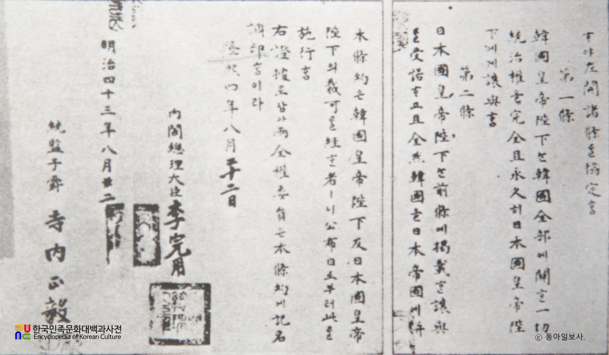한일합병은 1910년(대한제국 융희 4) 일제의 침략으로 한일합병조약에 따라 국권을 상실한 일이다. 경술국치라고도 한다. 1910년 조선의 3대 통감으로 온 데라우치 육군대신은 종래에 지니고 있던 사법·경찰권 외에 일반경찰권까지 완전히 장악하였다. 통감은 8월 16일 총리대신 이완용에게 합병조약안을 제시하고 수락할 것을 독촉했다. 22일 조약이 조인되면서 한국은 식민지로 전락했다. 조약 제1조에서는 ‘한국 전부에 관한 일체의 통치권을 완전히 또 영구히’ 넘길 것을 규정하고 있다. 이때부터 일제는 통감부를 폐지하고 총독부를 세워 식민지 통치를 시작했다.