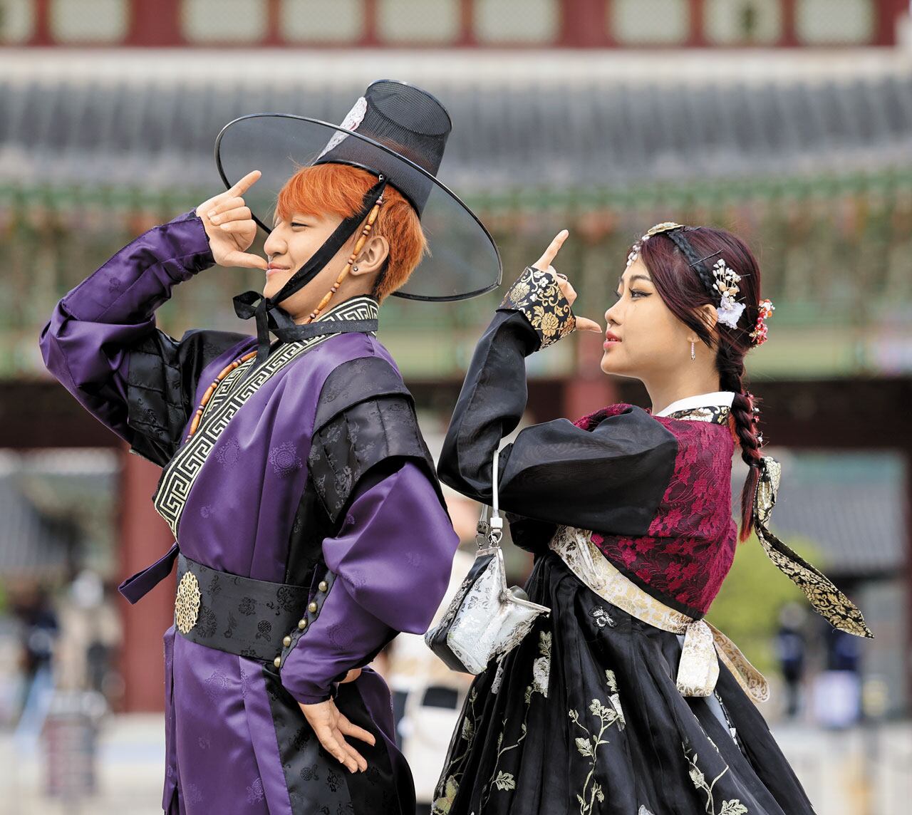 29일 오후 서울 종로구 광화문 앞에서 한복을 입고 갓을 쓴 외국인 관광객들이 넷플릭스 애니메이션 영화 ‘케이팝 데몬 헌터스(케데헌)’에 나오는 노래 ‘소다팝’의 안무를 따라 추고 있다.