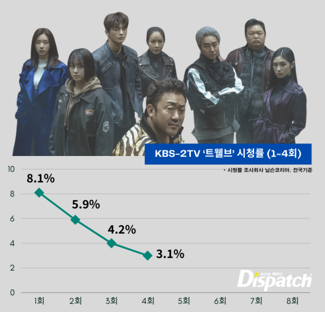 KBS의 야심작 '트웰브'에 대한 시청평이다. 실제로, 이 드라마는 8.1%로 시작해서 4회만에 반토막(8.1%->5.9%->4.2%->3.1%)이 났다.