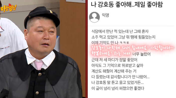 그러면서 "계산도 해주더라. 계산해 주는 거 다 들었는데 '감사합니다'라는 말이 안 나왔다. 강호동의 말을 듣고 울고 있었기 때문"이라고 덧붙였다. 그는 "이 글이 널리 널리 퍼졌으면 좋겠다"고 했다.