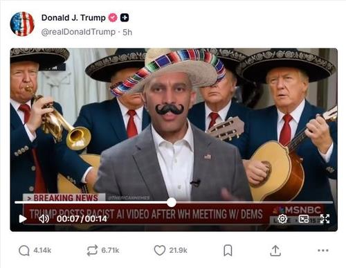 (서울=연합뉴스) 신창용 기자 = 도널드 트럼프 미국 대통령이 민주당 지도부를 멕시코인으로 희화화한 영상을 소셜미디어(SNS)에 게시해 인종차별 논란을 빚고 있다.