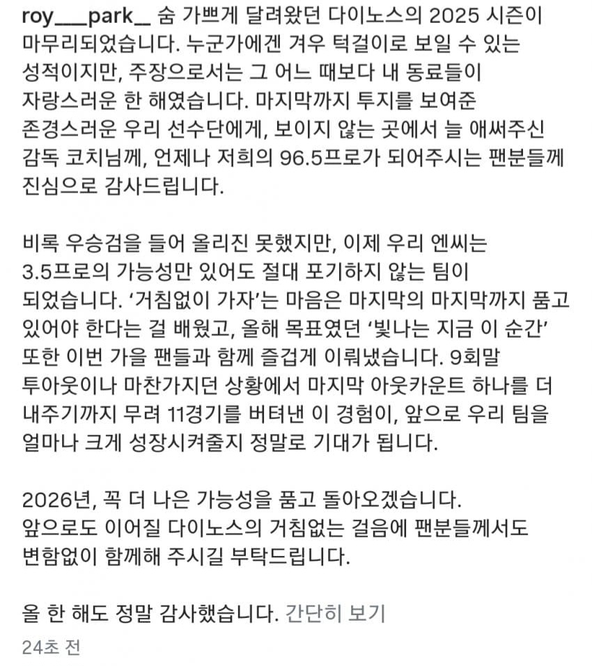 이슈 [KBO] NC 주장 박민우 25시즌 소감문
