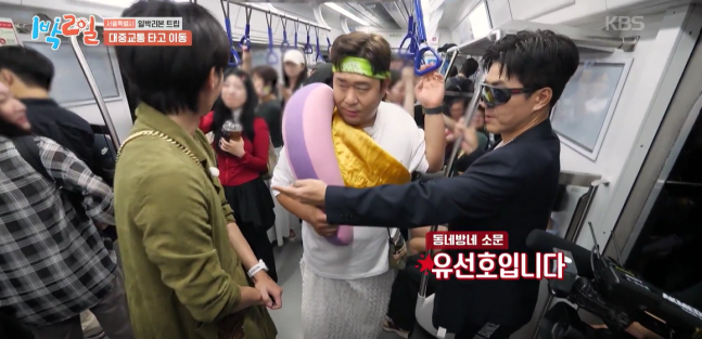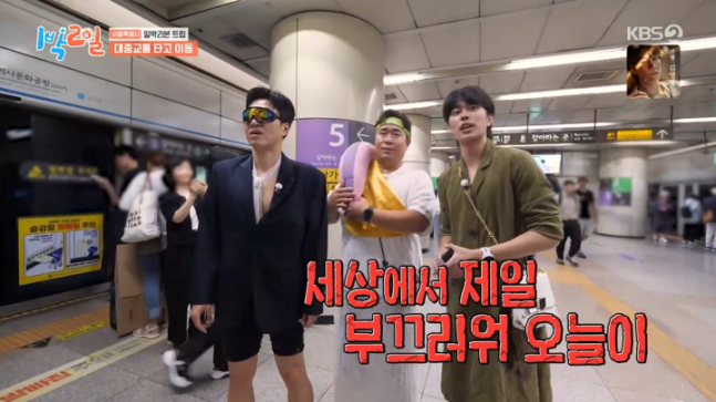 기사/뉴스 [1박2일] 김종민-문세윤-유선호, 2079년 패션 충격룩으로 지하철 탑승...“태어나서 가장 부끄러운 날”