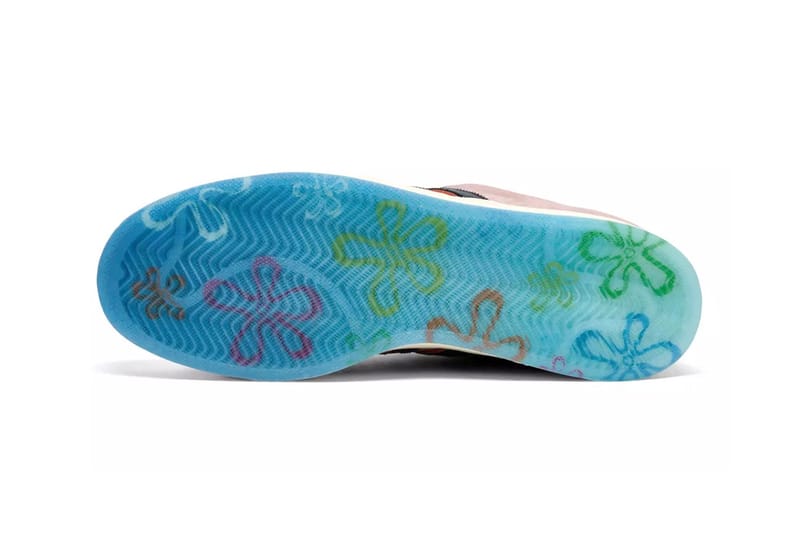 이 모델은 뚱이 특유의 연한 분홍색을 담은 부드러운 스웨이드 갑피로 제작되었으며, 텍스처가 살아있는 베이지색 가죽이 토박스를 구성합니다. 혀 부분에는 뚱이의 얼굴과 시그니처가 스탬프로 새겨져 있고, 인솔에는 스폰지밥 시리즈 로고와 뚱이의 초록색과 보라색 꽃무늬 반바지 모티프가 담겨 있습니다.