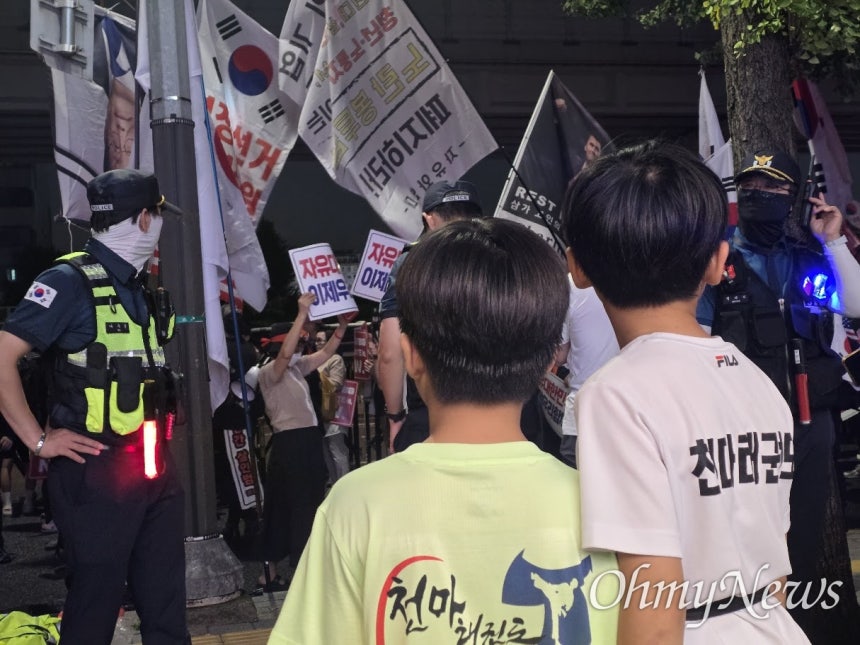 | ▲ 지난 9월 17일 오후, 서울 대림역 인근에서 벌어지고 있는 혐중 집회를 이 지역 초등학교 학생들이 바라보고 있다. |