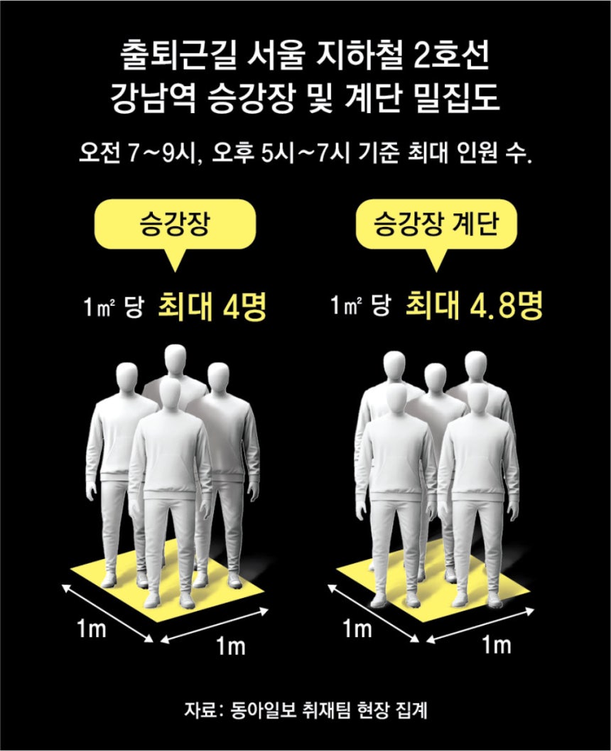 동아일보 취재팀이 2025년 1∼9월 서울 내 역별 승하차 인원수 상위 5곳의 인파 밀집도(면적당 인원수)를 분석했다. 23, 24, 27일 3일간 잠실역, 강남역, 홍대입구역, 서울역, 구로디지털단지역의 출퇴근길 승강장·계단에 머무는 인원수를 토대로 전문가 3명과 함께 밀집도를 산출했다. 서울교통공사 측으로부터 승강장 면적 등을 제공받아 출퇴근길(오전 7∼9시, 오후 5∼7시) 승강장과 계단에 몰리는 인원을 15분 간격으로 집계했다