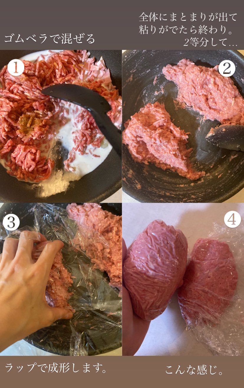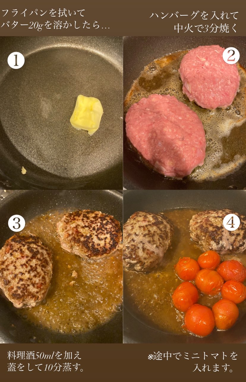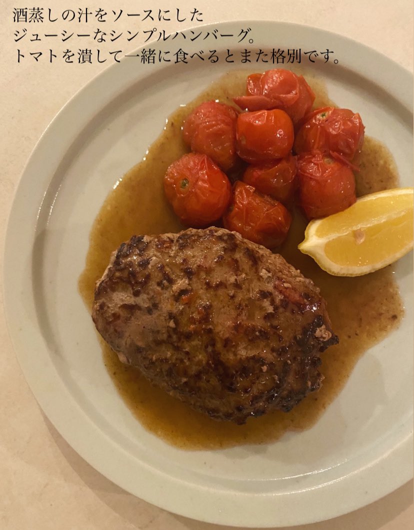 구운 햄버그 위에 찜 국물로 나온 소스를 끼얹고, 으깬 방울토마토와 함께 담는다.