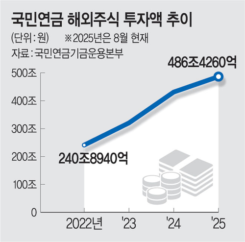 18일 국민연금기금운용본부에 따르면 8월 말 기준 국민연금 해외주식 투자 규모는 486조4260억 원으로 올해 들어 55조4290억 원 급증했다. 국민연금은 해외주식 투자를 위해 주로 달러 등 외화자산을 구매해 투자에 나선다. 문제는 국민연금의 해외주식 투자 확대 압력이 계속 커지고 있어 달러 수요가 늘고 있다는 점이다. 국민연금 보험료율은 내년부터 단계적으로 13%(현행 9%)까지 올라 수익이 계속 커질 것으로 예상되나 국내주식 투자 비중은 한도(14.9%)까지 찼다. 국민연금이 매년 100조 원 규모의 달러 매입이 예상돼 원화 약세(원·달러 상승)가 구조적으로 발생할 상황에 놓이면서 정부는 지난 14일 국민연금을 이례적으로 지목하며 환율 안정 방안을 마련하겠다고 밝혔다. 시중은행 부행장은 “그간 달러로 벌 만큼 벌었으니 이제는 팔라는 압박인 셈”이라고 분석했다.