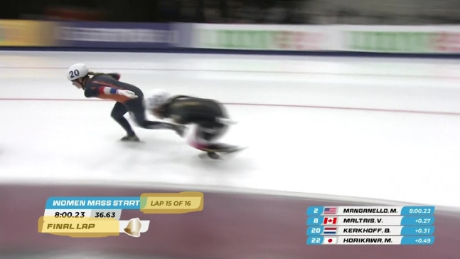 미아 망가넬로(미국), 발레리 말타이스(캐나다), 벵테 케르크호프(네덜란드), 모모카 호리카와(일본) 등 선두권을 형성한 선수들이 15번째 바퀴에 진입하는 순간 남은 바퀴 수를 보여주는 계기판에 '숫자 1'이 들어왔고, 마지막 바퀴를 뜻하는 종소리가 울렸다.