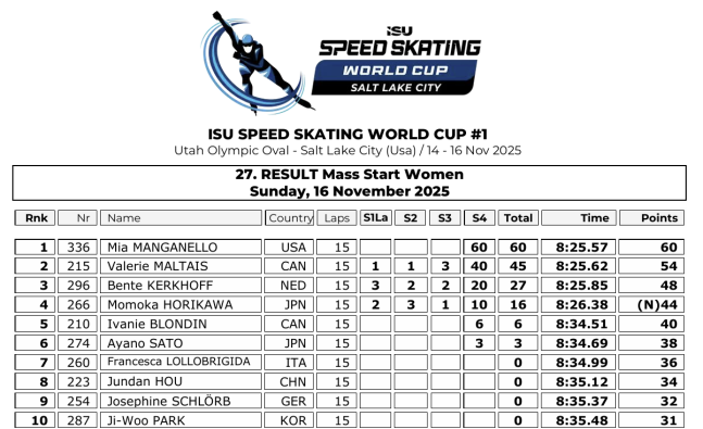 ISU 공식 홈페이지에 게시된 최종 결과지. 15바퀴를 기준으로 최종 성적을 매겼다. (출처 = ISU 홈페이지)