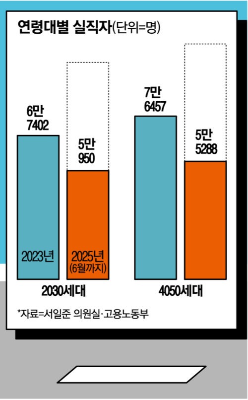 서일준 국민의힘 의원실이 고용노동부에서 제출받은 자료에 따르면 올해(6월 기준) 40·50대 실직자 수는 5만5288명을 기록했다. 반년간 실직자 수가 이미 지난해(7만6518명)의 70%를 넘는 수준이다. 이에 따라 올해 실직자 수가 최근 3년 새 최고치를 기록할 것이라는 우려도 나온다. 2023년 실직자 수는 7만6457명에 달했다.