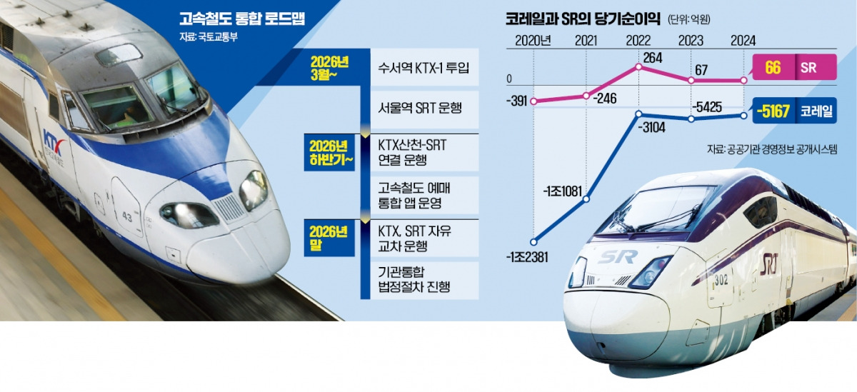 정부는 2016년 12월 SRT(수서발 고속철도)를 개통하며 “117년 한국 철도 역사에 경쟁 시스템을 도입하겠다”고 밝혔다. 그러나 10년도 채 되지 않아 다시 통합을 선택했다. SRT 도입 취지인 경쟁을 통한 서비스 향상보다 낭비되는 중복 비용이 더 많다는 판단에서다. 업계는 코레일(한국철도공사)과 SRT 운영사인 SR 통합과 관련해 임금, 재무구조 등 넘어야 할 산이 많다고 지적했다.