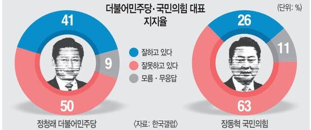 거대 양당의 장기 독점과 극단 대치 속에 국민 절반 이상이 정청래 더불어민주당 대표와 장동혁 국민의힘 대표 리더십을 부정 평가한 것으로 나타났다. 원내 절대 의석을 무소불위로 휘두른 집권여당, 생산적 정부 견제 대신 강성 지지층 앞으로 달려간 제1야당의 대표가 받은 낙제점은 정치 양극화가 심화한 한국 정당 정치의 현주소를 그대로 보여주고 있다.