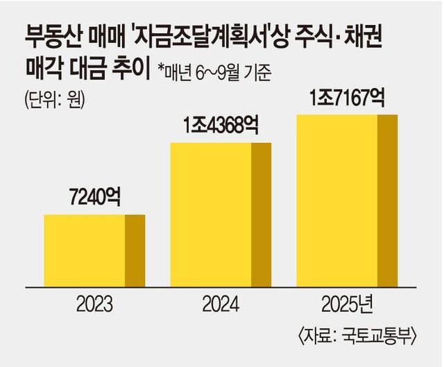 11일 국토교통부가 국회에 제출한 주택 구입 자금조달계획서 분석 결과에 따르면 지난 6~9월 ‘주식·채권 매각대금’으로 부동산 매입자금을 충당한 규모는 총 1조7167억원이었다. 1년 전 같은 기간(1조4368억원)보다 2800억원 늘었다. 2023년 같은 기간(7240억원)과 비교하면 배 이상 늘었다.