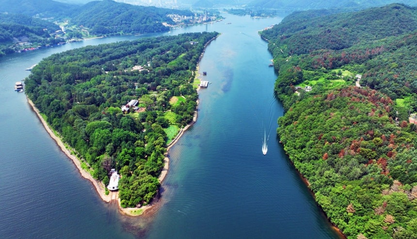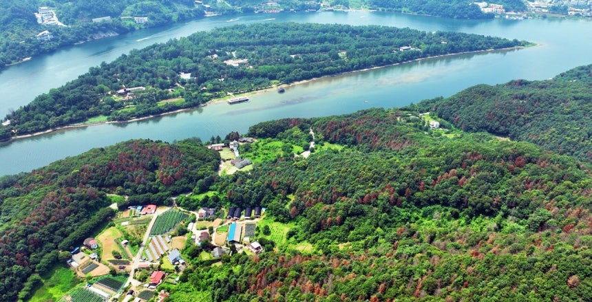 남이섬 인근 숲은 회복 불가능한 상태까지 재선충병이 확산되었음에도 남이섬은 초록을 유지 중이다.