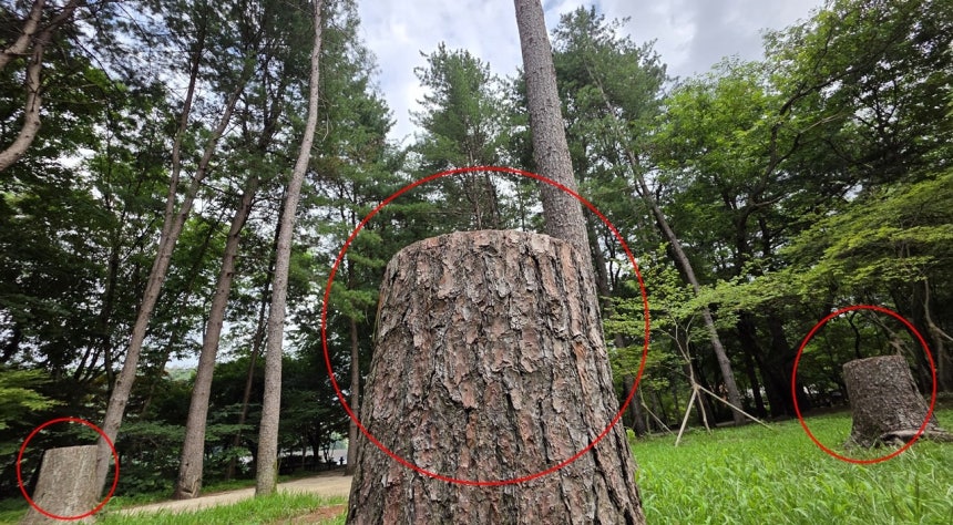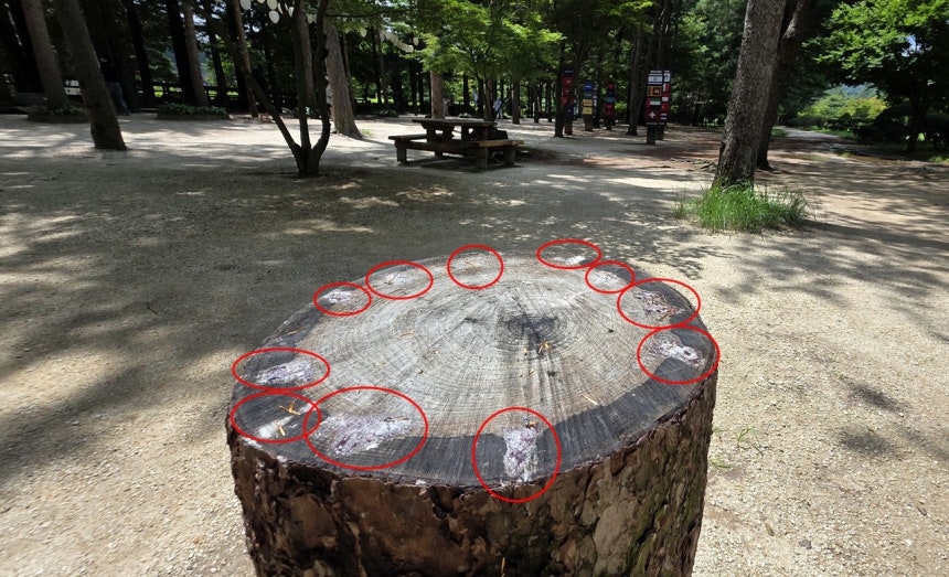 남이섬 안에 잘린 잣나무 그루터기 안에 재선충을 예방하기 위해 주입했던 농약 흔적들이 가득했다. 농약이 나무 안에 굳어 있는 모습이다.
