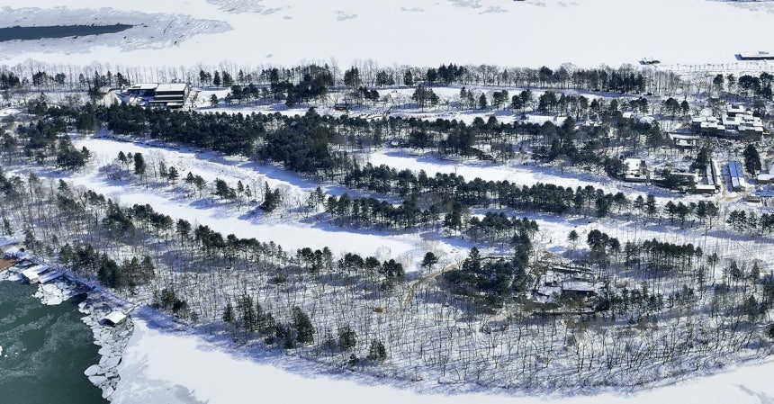 강이 꽁꽁 언 겨울 남이섬 풍경이다. 활엽수 나뭇잎이 떨어진 겨울이라 잣나무와 소나무가 남이섬에 얼마나 있는지 쉽게 확인된다. 만약 재선충병으로 이 나무들을 잃게 된다면, 관광지 남이섬 명성에 큰 타격이 불가피하다.