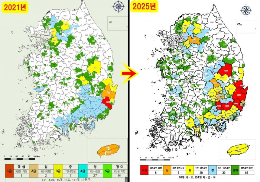 이렇게 재선충에 감염되어 고사되는 소나무 숲이 끝없이 이어지고 있다. 전국적으로 소나무재선충병의 확산세는 어느 정도일까? 산림청이 제작한 소나무재선충병 분포도를 찾았다. 2021년 4월과 2025년 5월의 재선충 확산을 비교해 보았다.