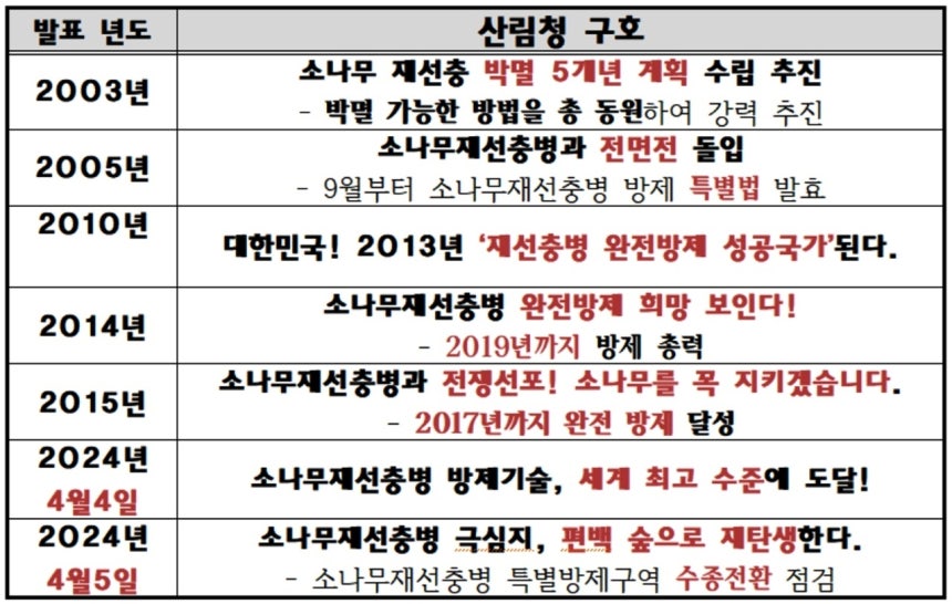산림청의 재선충병 방제 보도자료를 찾아 정리해보았다. 박멸, 전면전, 전쟁 선포 등을 주장했지만 모두 실패했다.