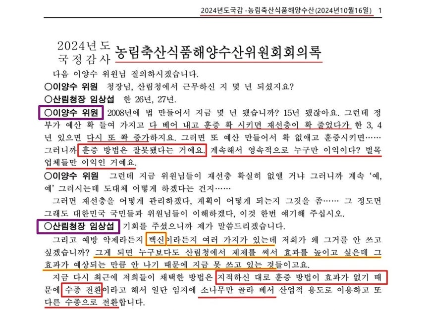 2024년 산림청 국정감사 녹취록이다. 훈증이 효과없음을 임상섭 산림청장이 시인했다.