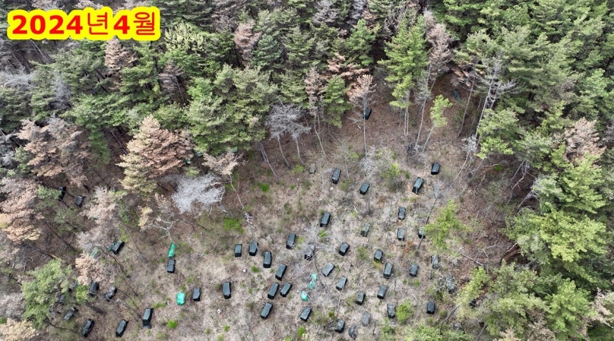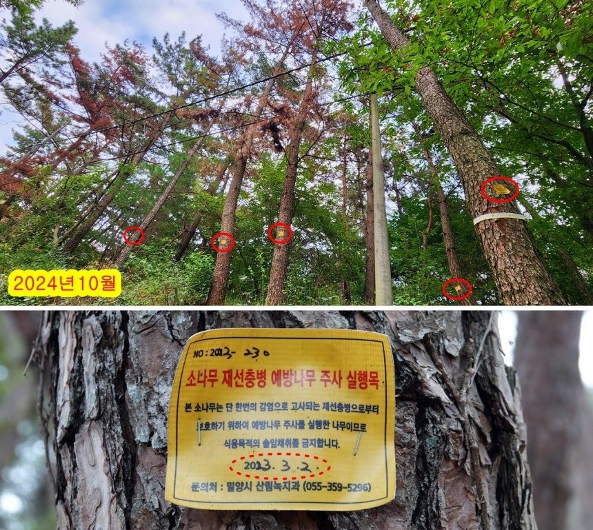 지난 2024년 10월 현장을 다시 찾아갔다. 재선충 방제 농약을 주입한 2023년 2월로부터 겨우 1년 8개월 지났을 뿐이다. 소나무들이 이미 붉게 죽어 있었다.